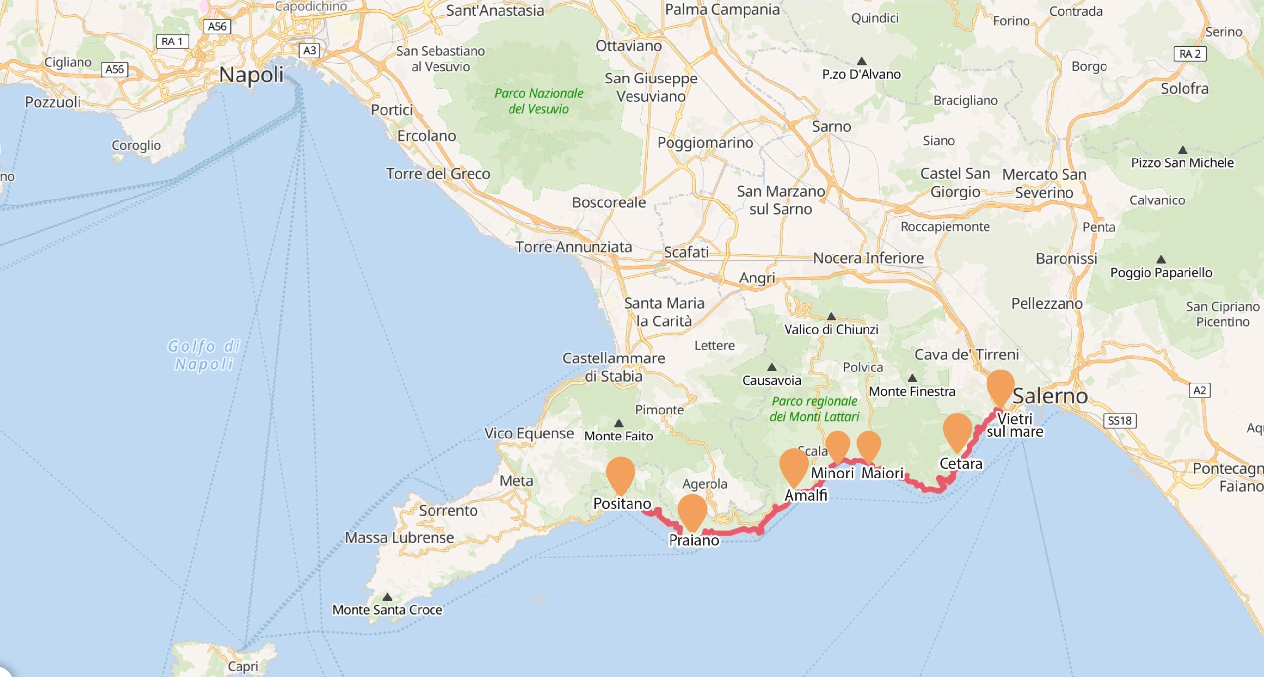 - from km 17+160 (Positano town limit) to km 19+800 (Praiano town limit);