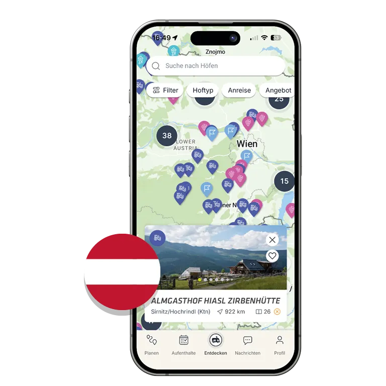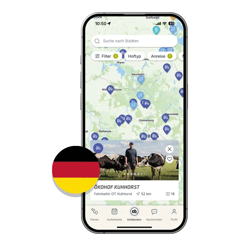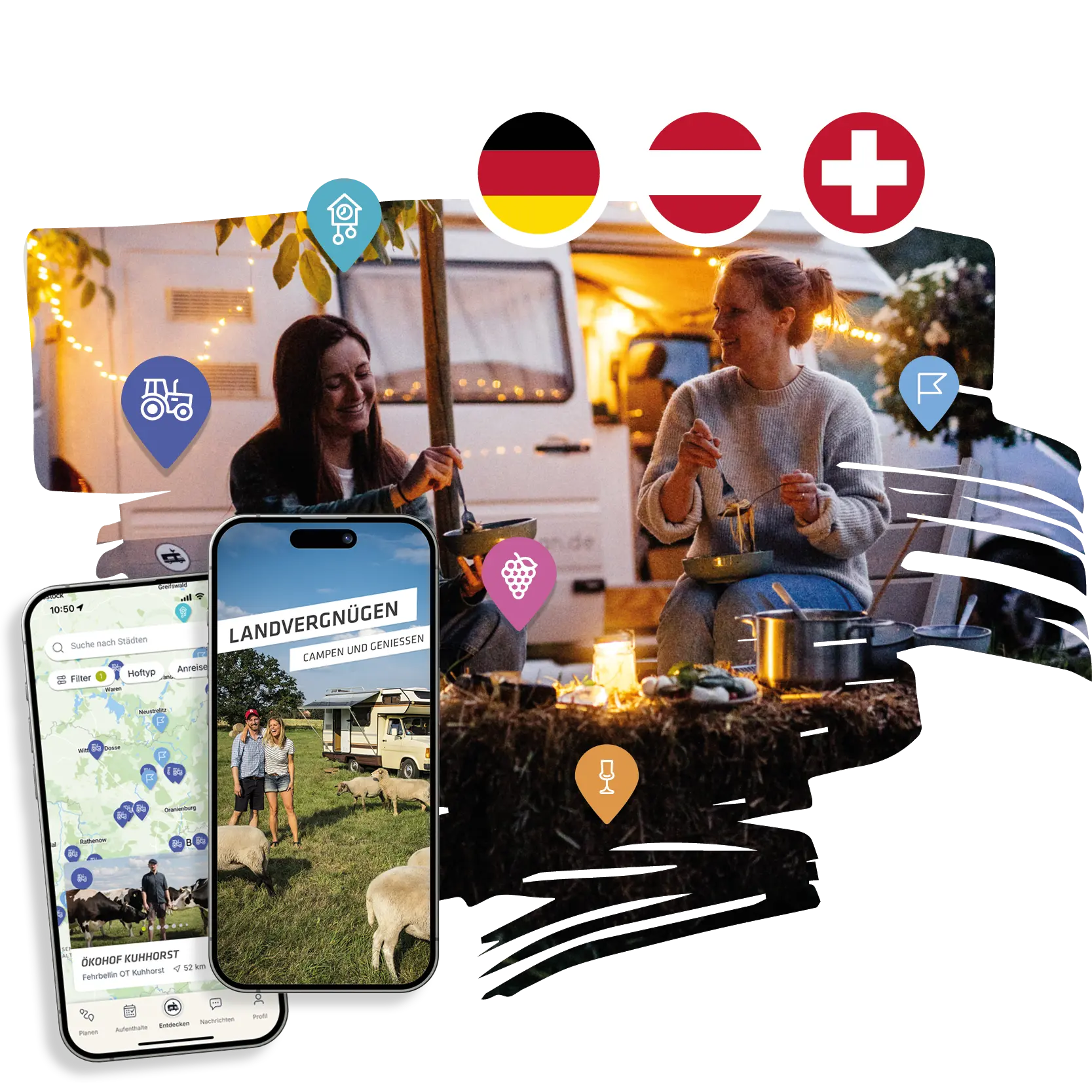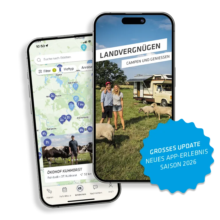With the Landvergnügen digital guide you can explore Germany, Austria and Switzerland in your motorhome, campervan, self‑contained caravan or roof‑top tent, staying for free for 24 hours at more than 2,100 carefully selected rural locations. You will experience real country life at farms, breweries, dairies, country estates and small artisan producers surrounded by nature.